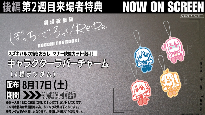 公開2週目となる8月17日(土)より配布される来場者特典は、本編の上映前に劇場で上映される、スズキハルカ描きおろしマナー映像のカットを使用した、キャラクターラバーチャーム(4種ランダム)に決定!