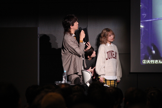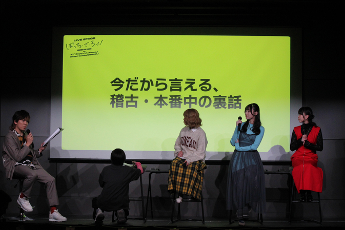 大竹の「コーラスマイク引き寄せ」は、制作スタッフによると大阪公演ではマイクが少し遠くに設置されてしまっていたにもかかわらず、引き寄せてスムーズにコーラスに入っていたのがかっこよかった、とのこと。しかし大竹は「忘れてました」。ここで山崎から、「役としてお芝居をしながら演奏をするのは難しい?」と質問が。大森は「元々の自分の演奏が(確立されて)ないから、これしかない! ので」それほど演奏にこだわりはなく、スムーズにできたとのこと。守乃は、下を向いて演奏する後藤ひとり役なので「演奏に集中できるのでちょうどよかったです」との談。小山内は「“私”のままでこのZeppに立ったらとんでもないことになってしまうので、かっこよく演奏できるリョウちゃんでよかった」とコメントした。