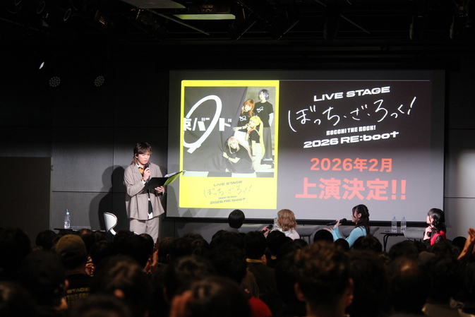 の告知が出ると、大歓声と拍手が場内から上がった。タイトルは【LIVE STAGE「ぼっち・ざ・ろっく!」2026 RE:boot】「再構築、作り直す」の「リブート」の名の通り、2024年の公演ではPART Ⅰ STARRY/PART Ⅱ 秀華祭と2本に分けた舞台を再構成し、1本にまとめた新作の舞台にするということだ。
