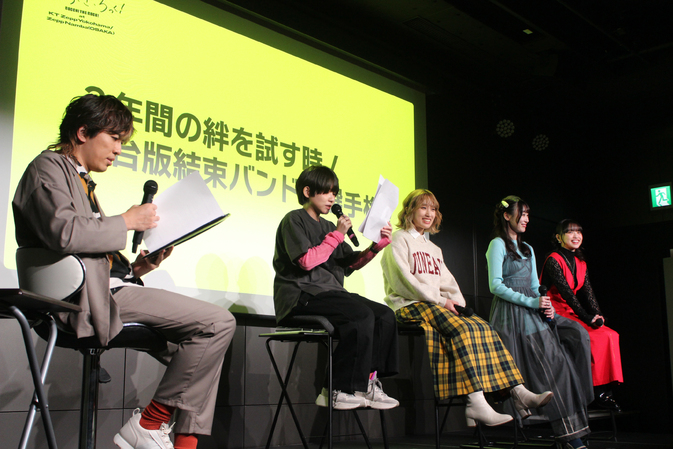6月22日(日)にKT Zepp Yokohama、6月30日(月)にZepp Namba(OSAKA)で開催されたライブは、劇中曲を演奏するだけではなく、舞台から派生したライブとしての演出と、原作ファンも納得のセットリストで開催されたイベントとなった。ライブ以来会っていなかったという4人だが、守乃と大竹は「牛タン…」「あっ、牛タン…」と2人で会った日があった様子。しかし数か月ぶりであっても、会った瞬間に「いつもどおりに(小山内)」なれる4人の絆はさすがのひとこと。山崎からも「僕もその空気に混ぜてくれる」とコメントが。しかし「(山崎も入れて)5人で撮影をした後、キャスト4人でまた撮りなおしている」との山崎からの告白に、場内とキャストたちから笑い声が上がった。
